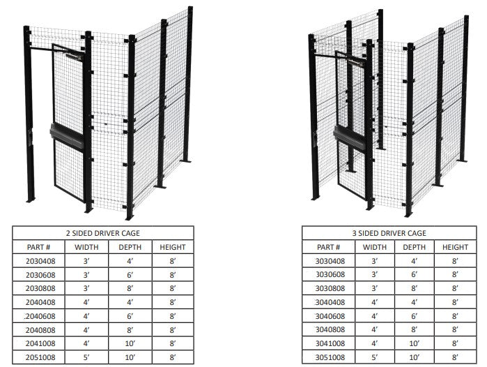 Complete cage: Cages include a 3′ swing door with a push bar on the warehouse side and a keyed lock on the driver side.